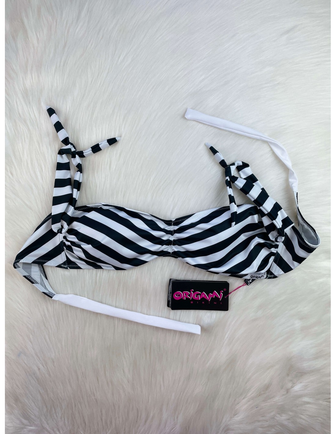 Origami Bikini bandeau bra → Removable moulded cup with side brace, tied at the back.