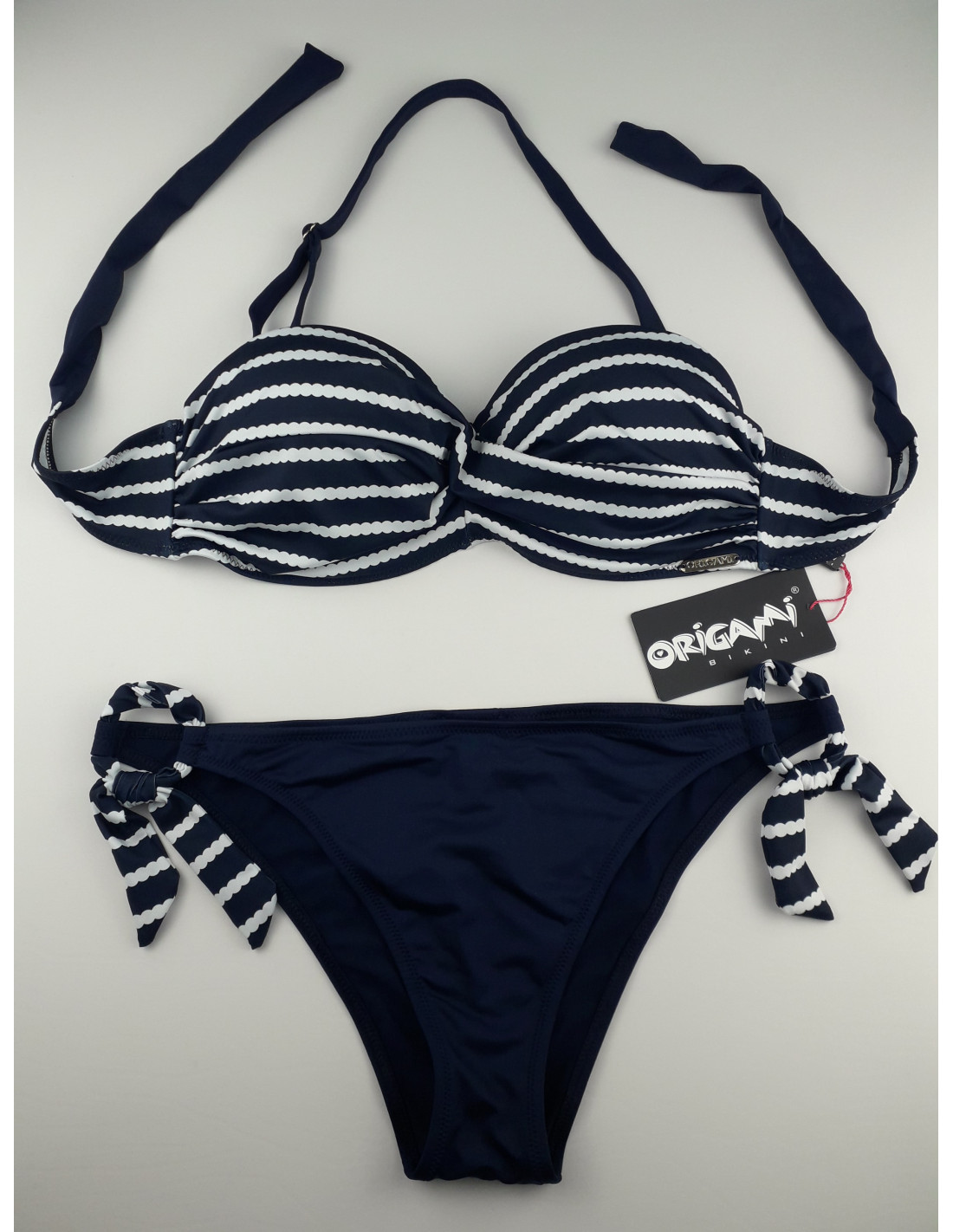 Origami Bikini C-CUP bandeau bra → underwired moulded cup, side brace, twisted cover fabrics, inner silicone strap against slipping. Removable or adjustable neck strap, and tied at the back. Always check the bottom size of the top made for it when selecting the size, as it may differ in some cases!