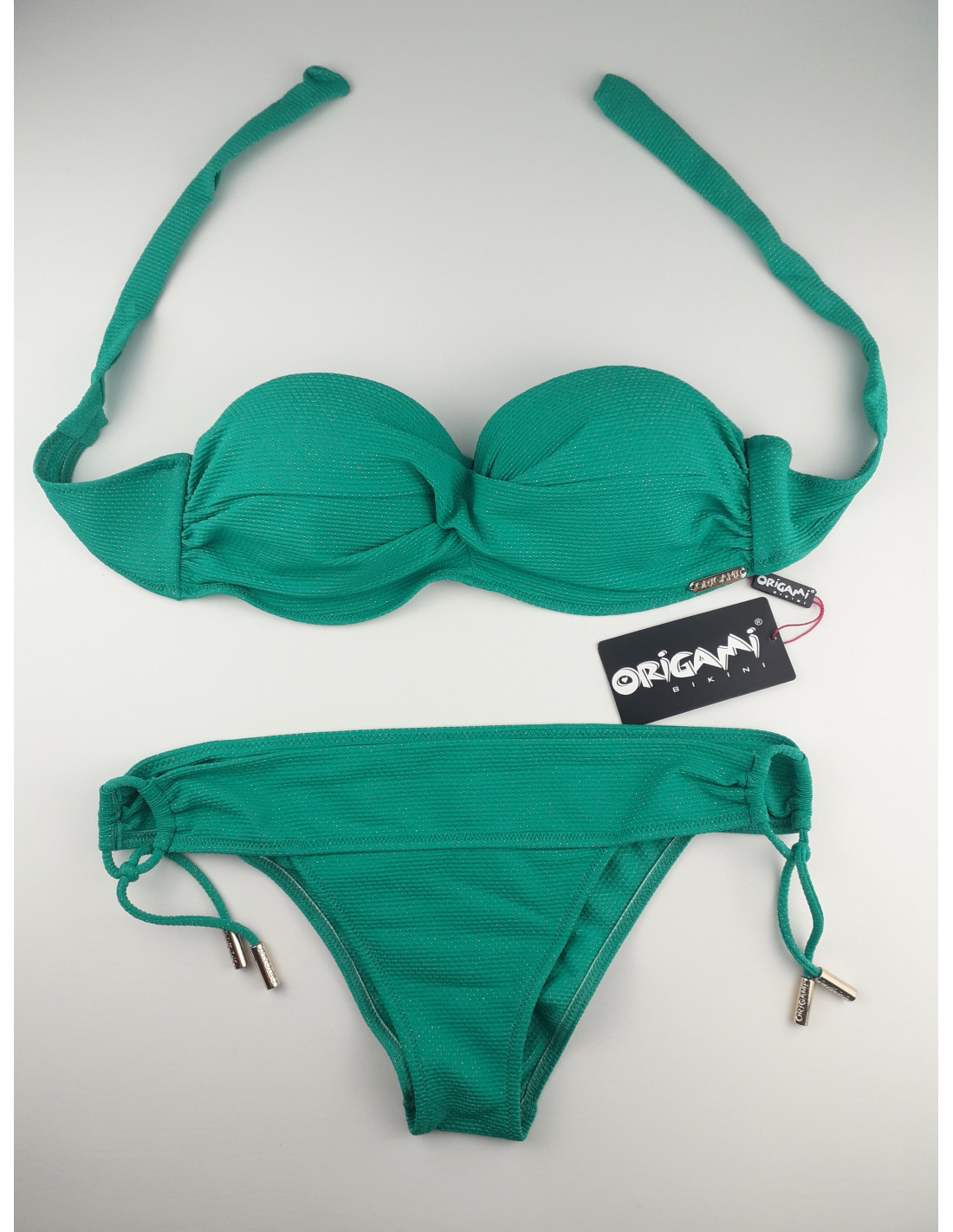 Origami Bikini C-CUP bandeau bra → underwired moulded cup, side brace, twisted cover fabrics, inner silicone strap against slipping. Removable or adjustable neck strap, and tied at the back. Always check the bottom size of the top made for it when selecting the size, as it may differ in some cases!