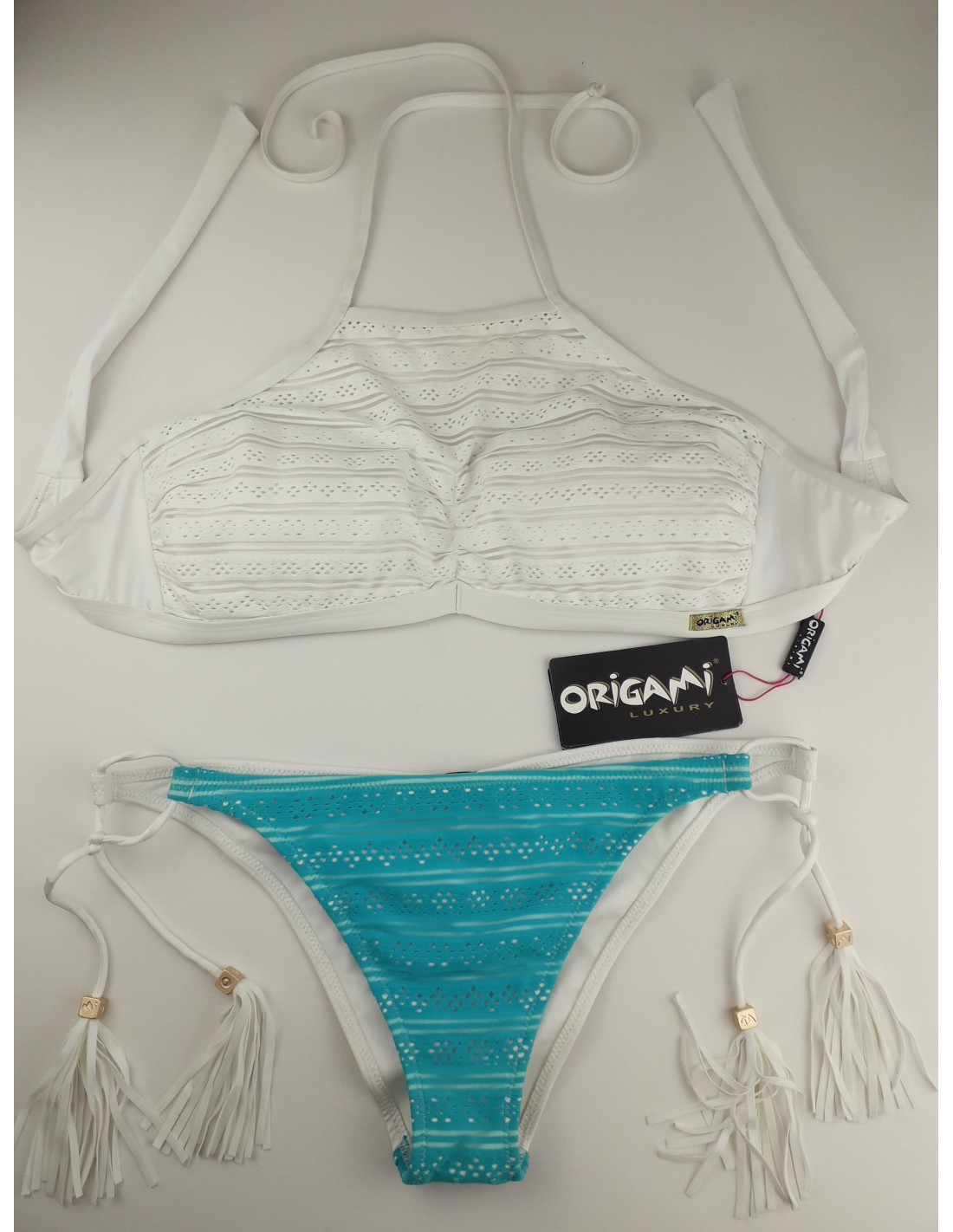 Origami Bikini Luxury kivehető szivacsos magas nyakú top → kivehető formakosárral, oldal merevítéssel, megkötős nyakpánttal, megkötős hátrésszel.